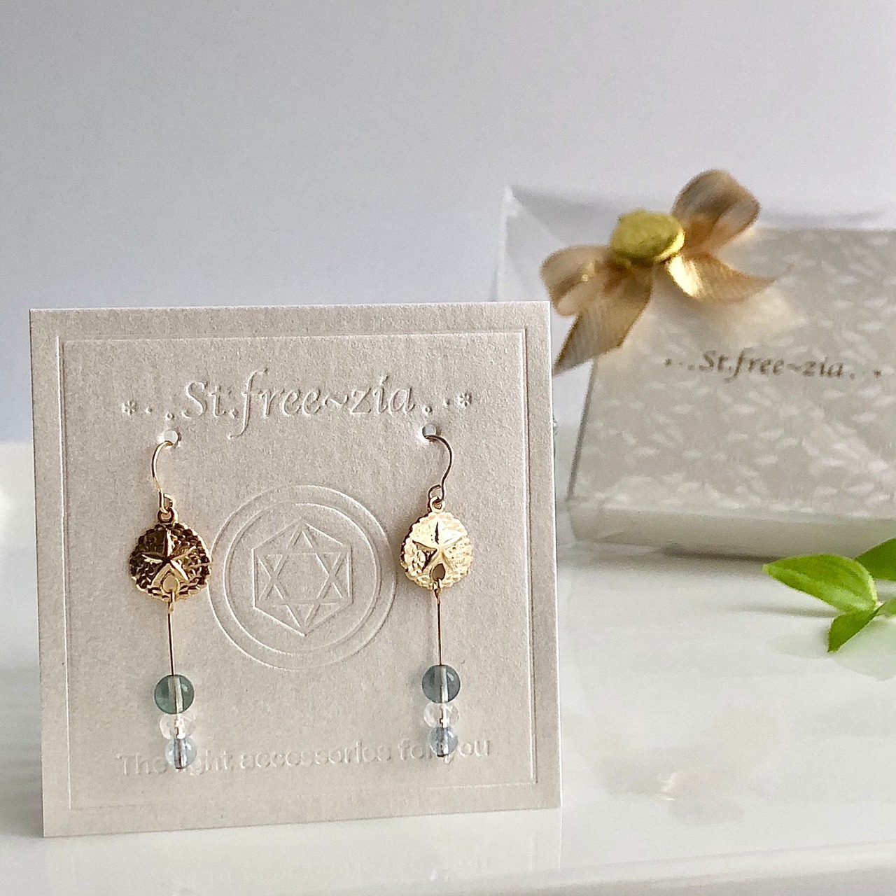 14kgf ブルーグリーンフローライトとサンドダラーのフックピアス