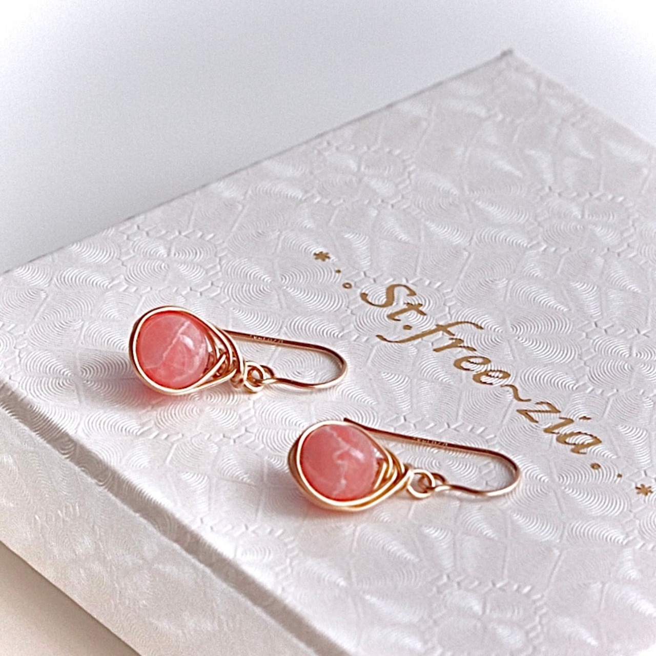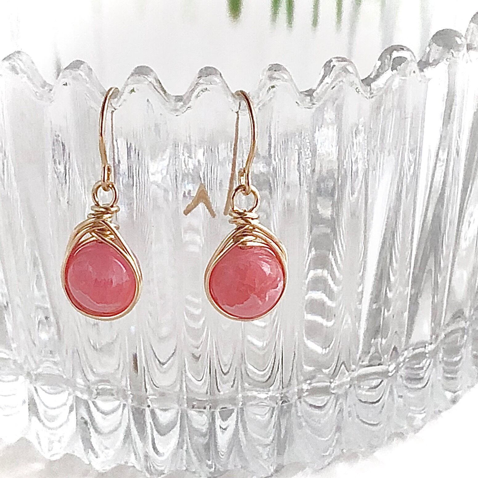 ピンクカラーが人気なアルゼンチン産のインカローズ を14kgfワイヤーでドロップ型にラップした"ドロップシリーズ" のピアスです。