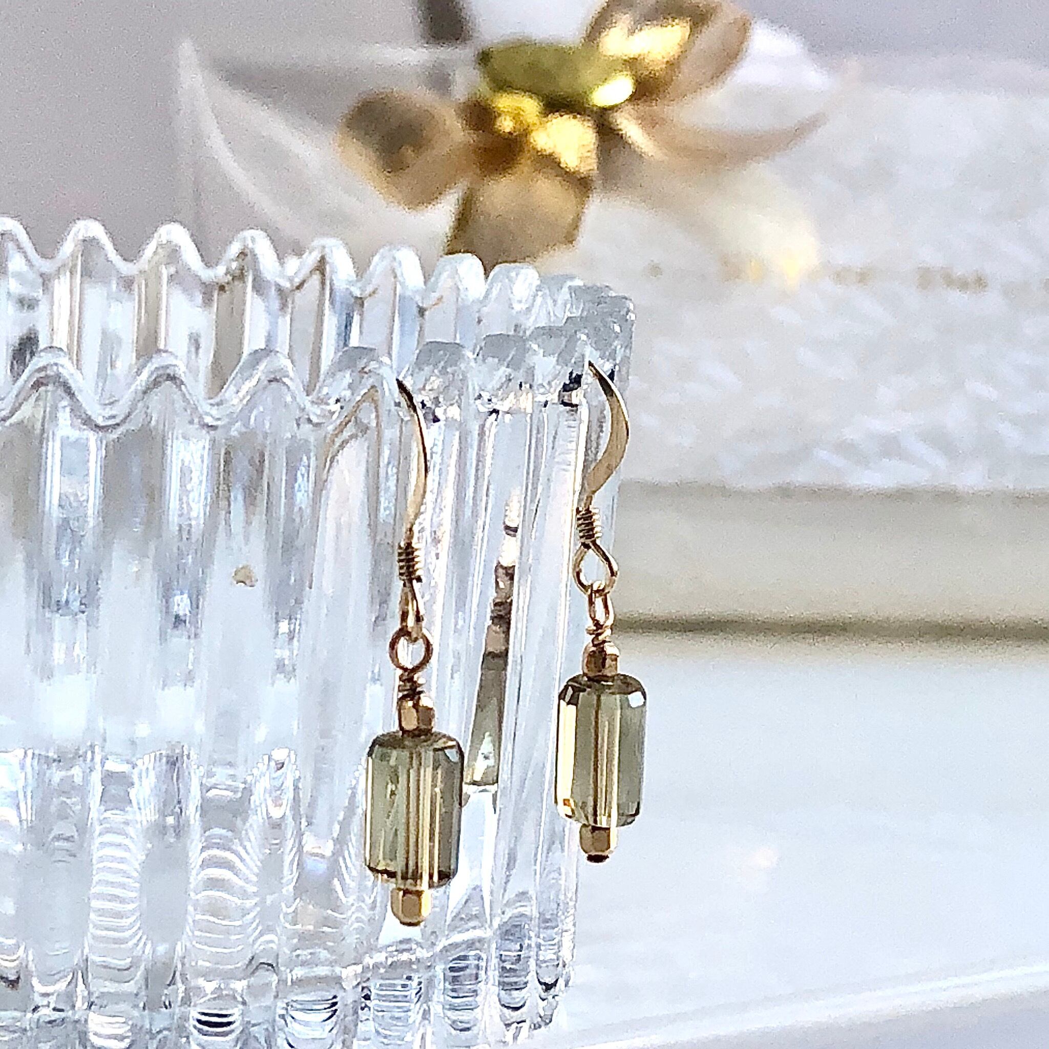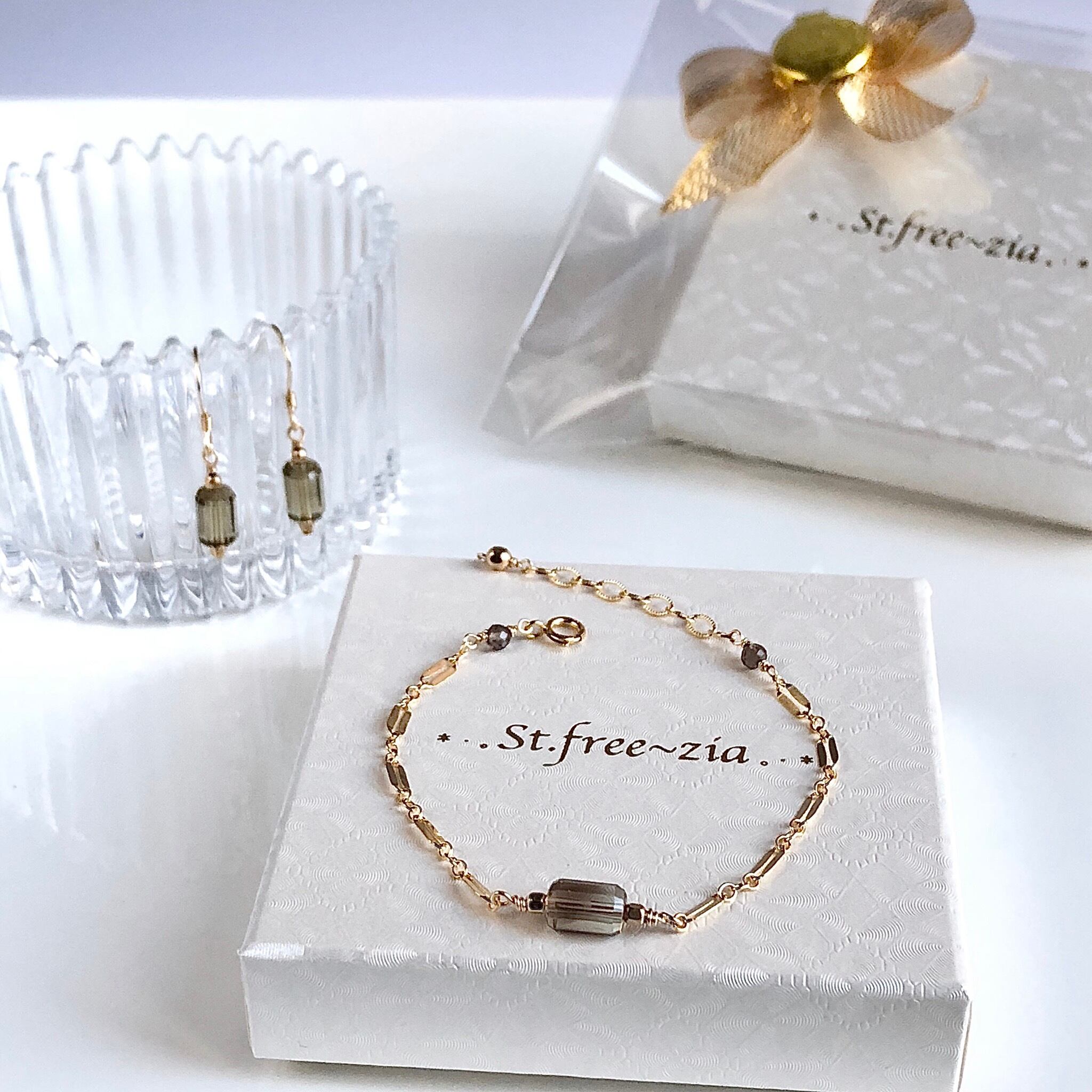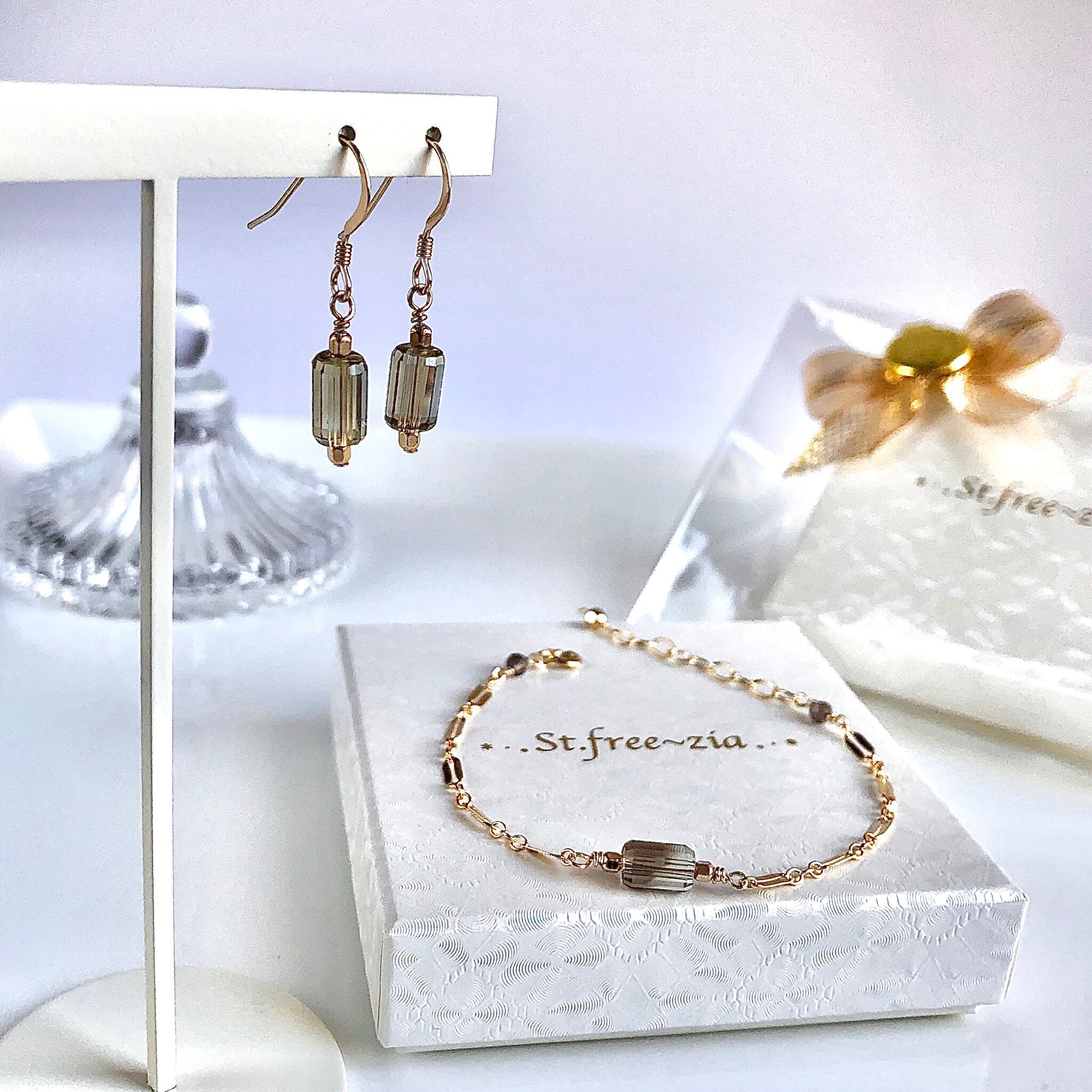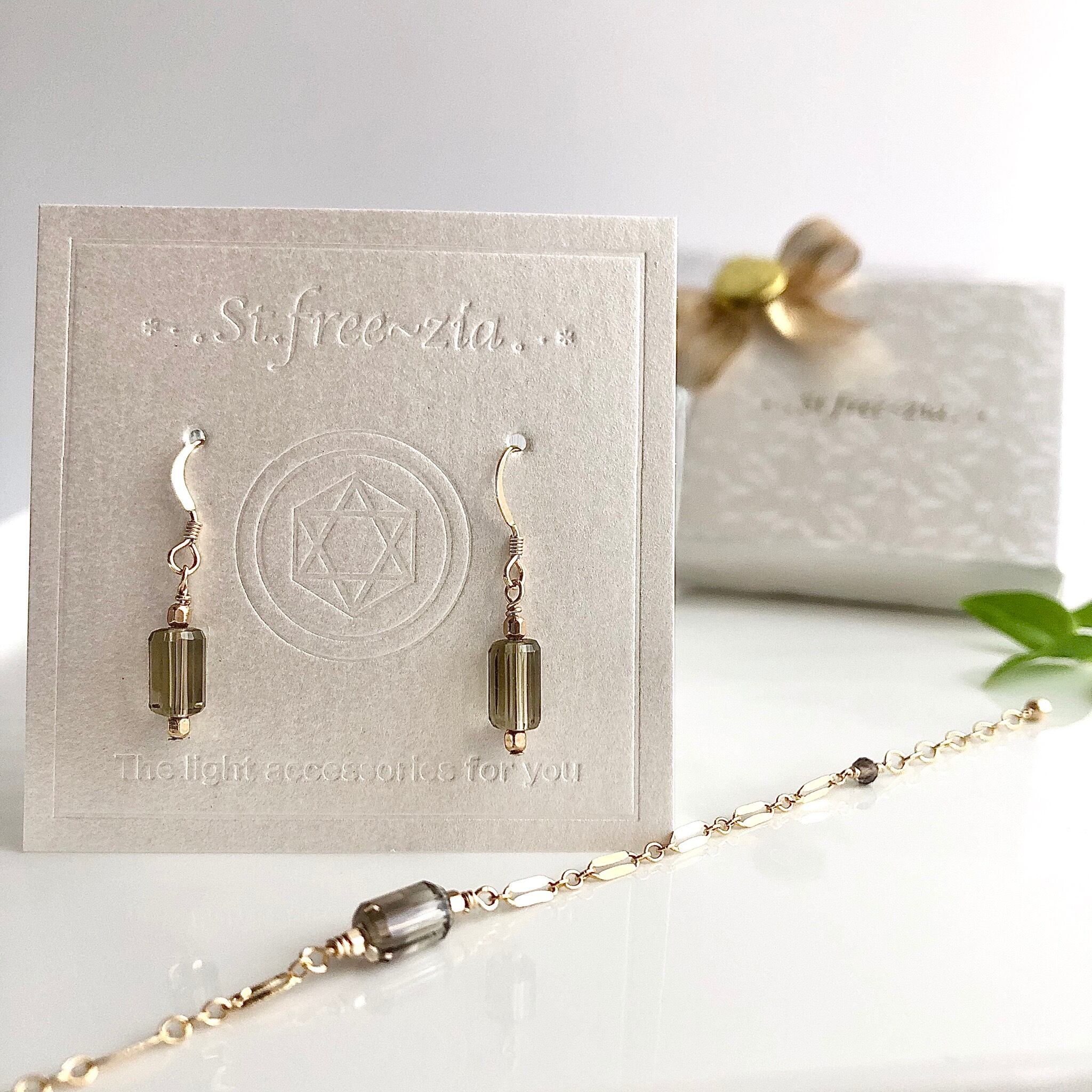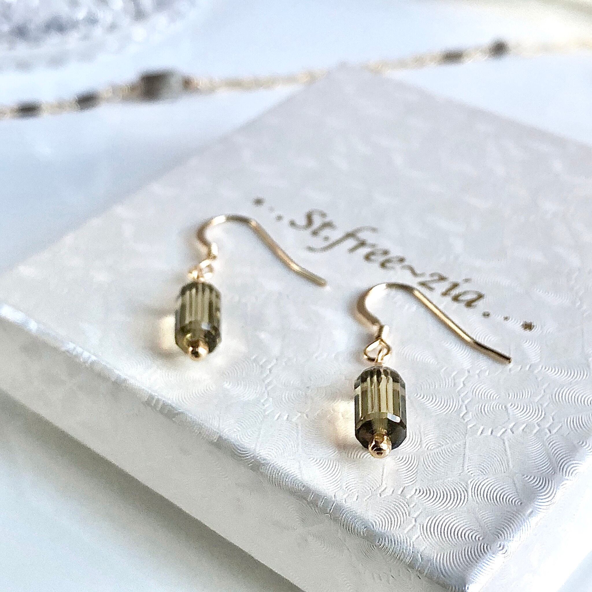 珍しいチューブカットが施されたレモンスモーキークォーツと12kgfのカットビーズを合わせ、シンプルで大人っぽいピアスに仕上げました。